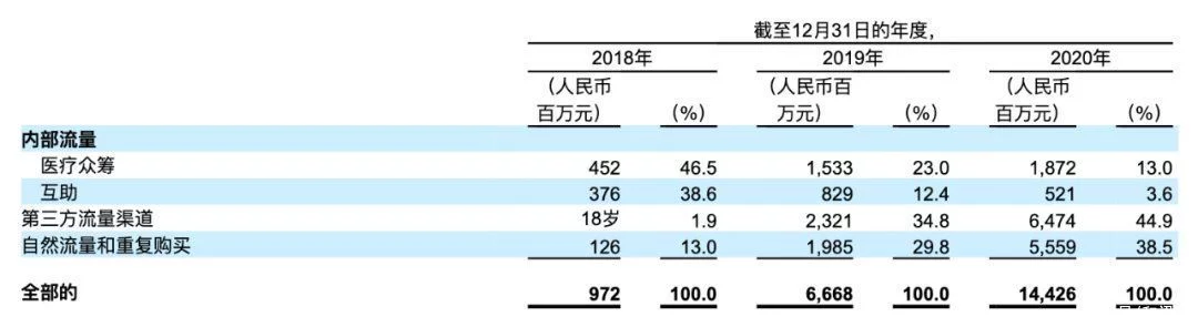 另外需要注意的是,水滴公司起家的水滴筹业务在整体流量占比上逐年下跌。其为公司带来的流量自2018年至2020年的占比分别为46.5%、23%、13%,而第三方流量渠道的占比逐渐增加,三年占比变化分别为1.9%、34.8%、44.9%,显示了水滴公司内部流量与自然流量计重复购买消费力的减弱,以及外部采买流量压力的剧增。