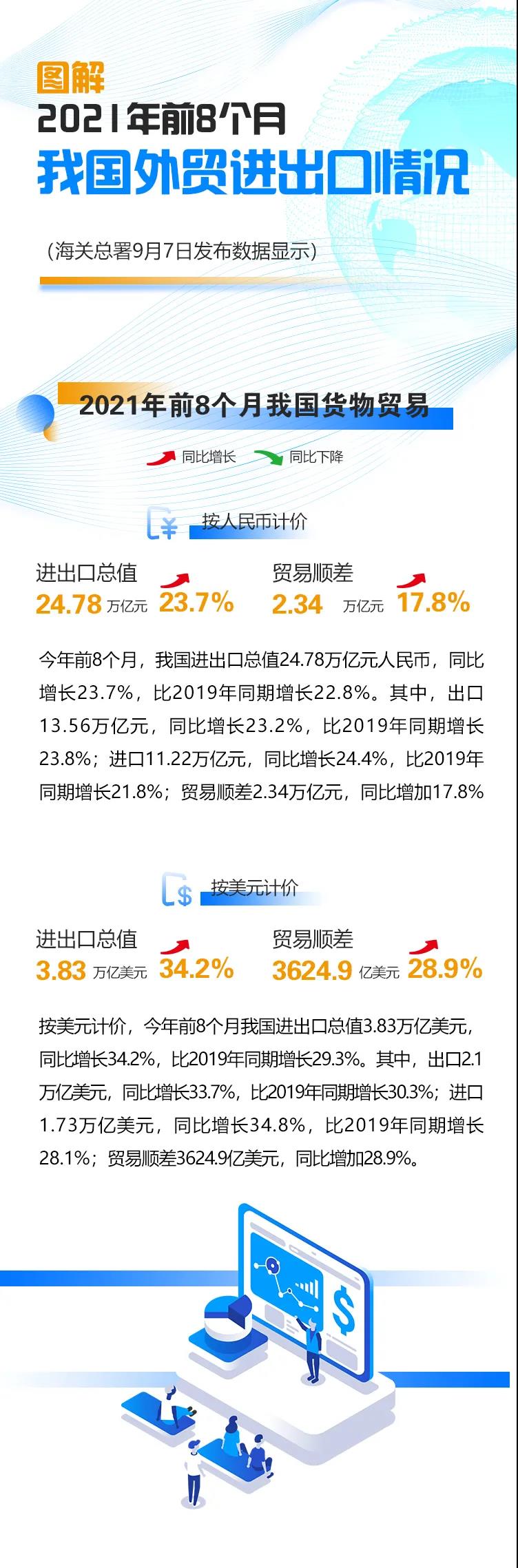 具体来看,前8个月我国出口13.56万亿元,增长23.2%;进口11.22万亿元,增长24.4%。
