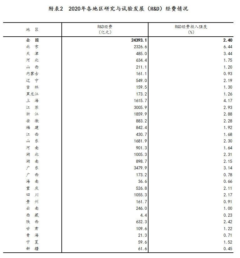 人民网北京9月22日电 (申佳平)据国家统计局官网消息,国家统计局、科学技术部和财政部近日联合发布《2020年全国科技经费投入统计公报》(以下简称《公报》)显示,2020年我国研究与试验发展(R&D)经费投入总量突破2.4万亿,达到24393.1亿元,比上年增加2249.5亿元,增长10.2%,增速比上年回落2.3个百分点。