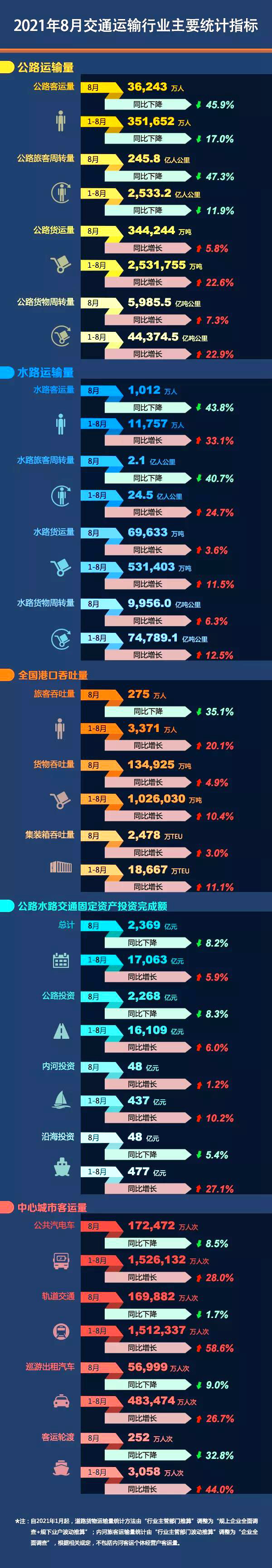 人民网北京9月23日电 (记者王连香)日前,交通运输部发布2021年8月交通运输行业主要统计指标,数据显示,8月公路客运量36243万人、水路客运量1012万人、港口旅客吞吐量275万人,中心城市轨道交通169882万人次。此外,1-8月我国公路水路交通固定资产投资达17063亿元,同比增长5.9%。