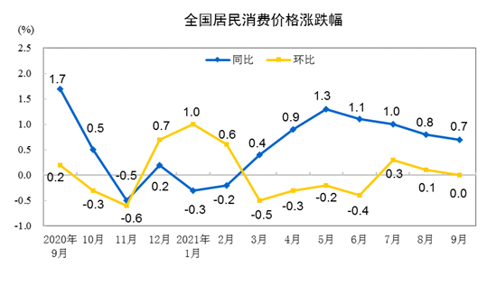 人民网北京10月14日电 (申佳平)国家统计局官网今日显示,9月份,全国居民消费价格(CPI)同比上涨0.7%,环比持平;全国工业生产者出厂价格(PPI)同比上涨10.7%,环比上涨1.2%。