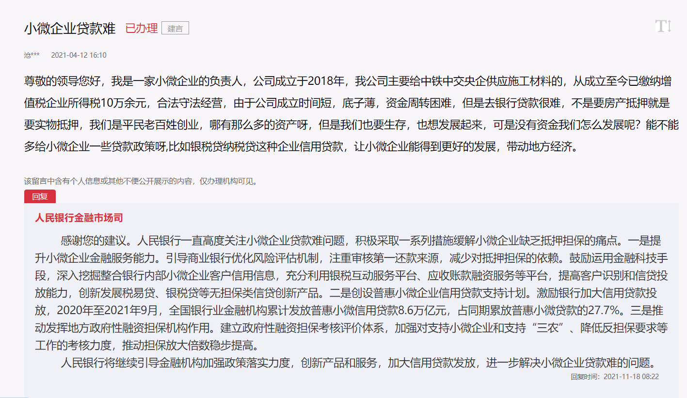 “我们一直高度关注小微企业贷款难问题,积极采取一系列措施缓解小微企业缺乏抵押担保的痛点。”人民银行在回复网友时表示,将继续引导金融机构加强政策落实力度,创新产品和服务,加大信用贷款发放,进一步解决小微企业贷款难的问题。