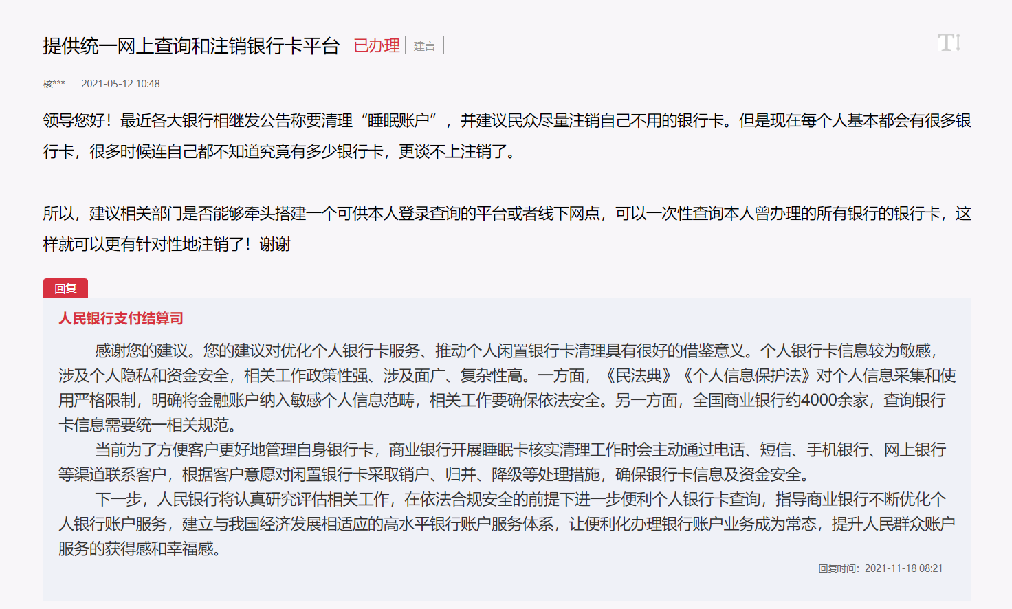 同样对银行账户服务有着较大需求的,是遍布在全国各地的人民群众。有网友在人民网“领导留言板”上留言表示,当下各大银行建议民众注销不使用的银行卡,但很多人忘记自己有多少张银行卡,因此希望搭建可供本人登录查询的平台或线下网点,一次性查询、注销银行卡。
