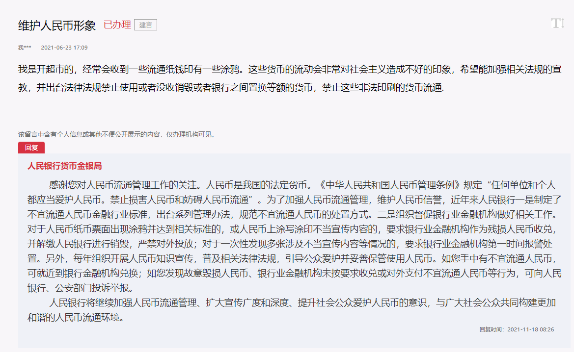 有网友在人民网“领导留言板”上留言表示,正在流通中的人民币纸币有出现涂鸦的现象,希望能加强相关法规的宣教,并出台法律法规禁止使用或者没收销毁。