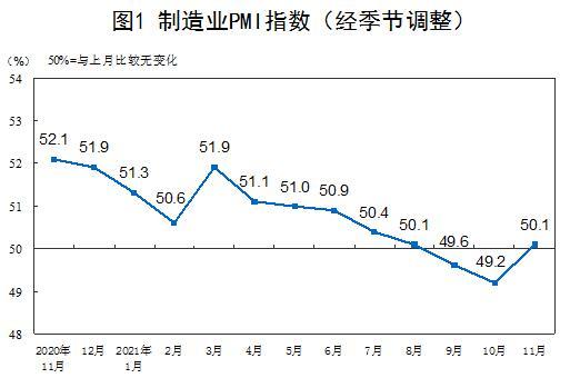 中新网11月30日电 国家统计局30日在官网公布2021年11月中国采购经理指数运行情况。数据显示,11月份,中国制造业采购经理指数(PMI)为50.1%,比上月上升0.9个百分点,位于临界点以上,制造业重回扩张区间。