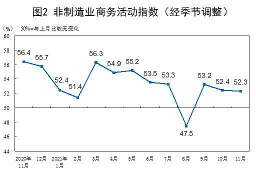 此外,11月份,非制造业商务活动指数为52.3%,比上月略降0.1个百分点,继续高于临界点,非制造业保持稳定恢复。