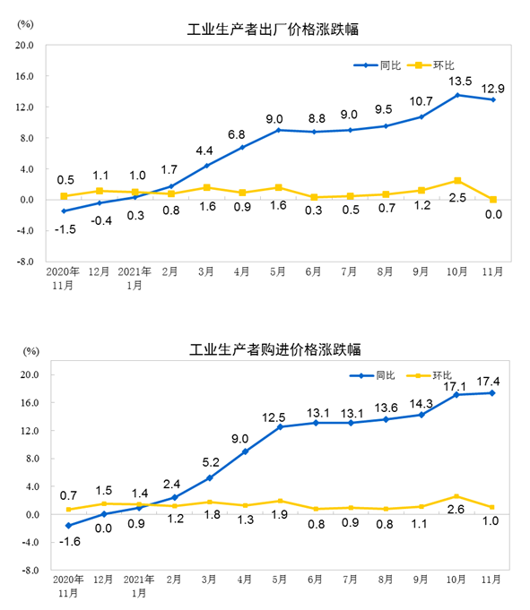 人民网北京12月9日电 (记者杨曦)国家统计局今日发布数据显示,2021年11月份,全国工业生产者出厂价格同比上涨12.9%,环比持平;工业生产者购进价格同比上涨17.4%,环比上涨1.0%。1—11月平均,工业生产者出厂价格比去年同期上涨7.9%,工业生产者购进价格上涨10.7%。