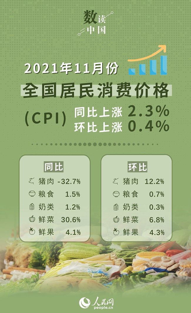 人民网北京12月9日电 (记者杨曦)国家统计局今日发布数据显示,2021年11月份,全国居民消费价格(CPI)同比上涨2.3%,环比上涨0.4%。1—11月平均,全国居民消费价格比上年同期上涨0.9%。