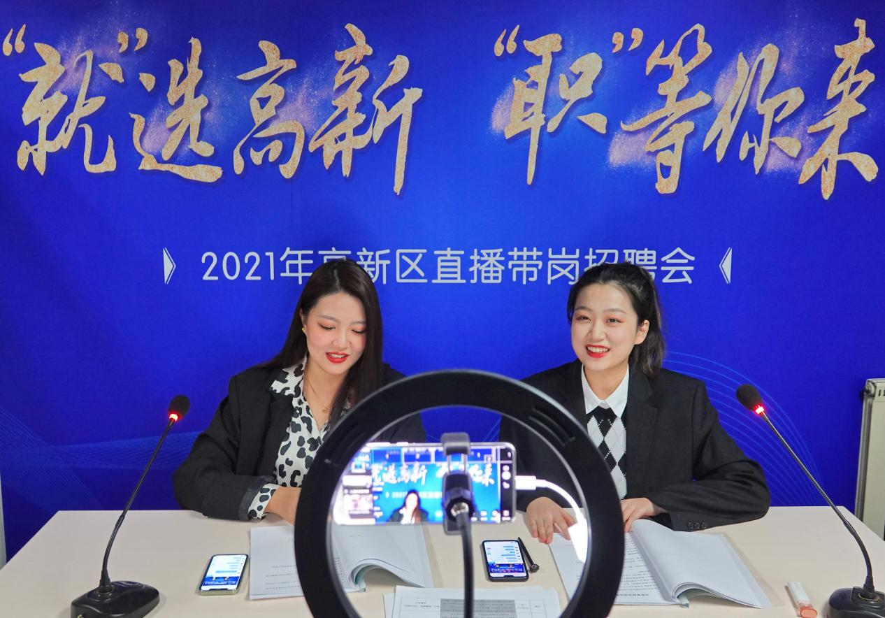 2021年11月23日,山东烟台高新区举办直播带岗招聘会,为求职群体充分就业提供便利。图片来源:唐克/人民图片