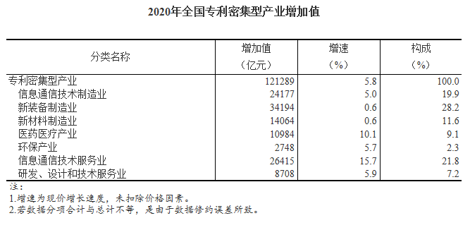 人民网北京12月30日电 (记者杨曦)国家统计局今日发布数据显示,经核算,2020年全国专利密集型产业增加值为121289亿元,比上年增长5.8%(未扣除价格因素,下同),比同期国内生产总值(GDP)现价增速高3.1个百分点;占GDP的比重为11.97%,比上年提高0.35个百分点。