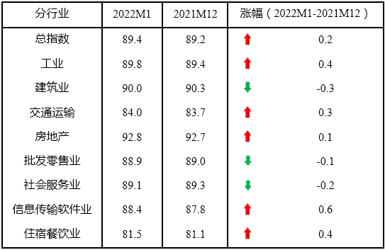 五是劳动力市场总体稳定。稳岗就业政策助力就业市场保持总体平稳,但疫情反复以及春节临近、生产活动放缓导致劳动力供应放缓。1月劳动力指数为105.6,比上月上升0.1点。其中,劳动力需求指数为98.8,上升0.4点;供应指数为112.4,下降0.3点,高于景气临界值。