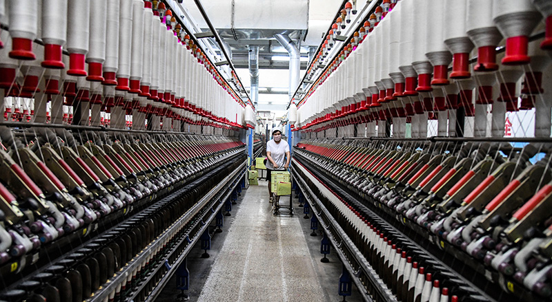2月12日,工人在河南省济源市欣天纺织有限公司的生产线上作业。新华社发(苗秋闹 摄)