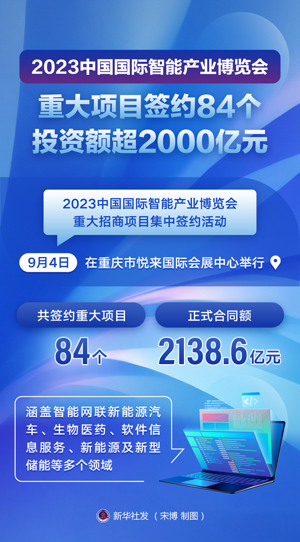 新华社重庆9月4日电(记者伍鲲鹏)2023中国国际智能产业博览会重大招商项目集中签约活动4日在重庆市悦来国际会展中心举行,共签约重大项目84个,正式合同额2138.6亿元,涵盖智能网联新能源汽车、生物医药、软件信息服务、新能源及新型储能等多个领域。